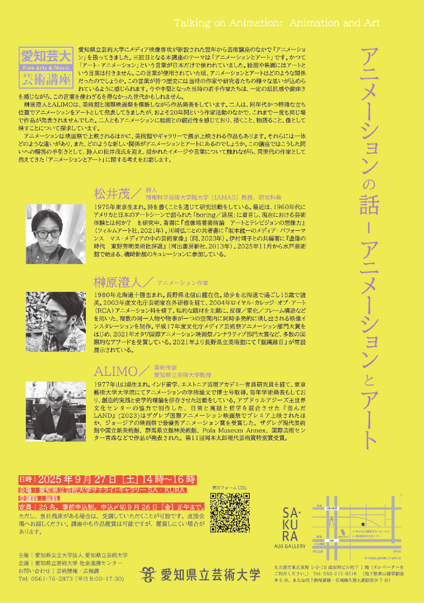 また、会期中9月27日には、榊原澄人(アニメーション作家)、松井茂(詩人、情報科学芸術大学院大学教授)、ALIMO(美術作家、本学メディア映像専攻教授)によるアーティストトークを行います。